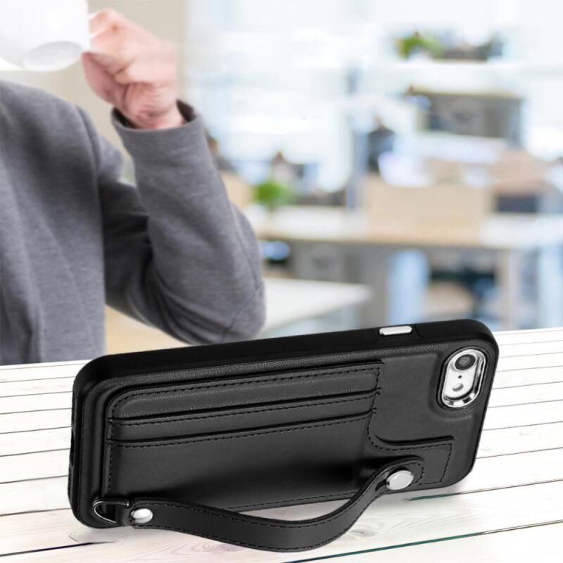 For iPhone SE 2022/SE 2020/6/7/8 Shockproof Leather Phone Case with Wrist Strap(Black)