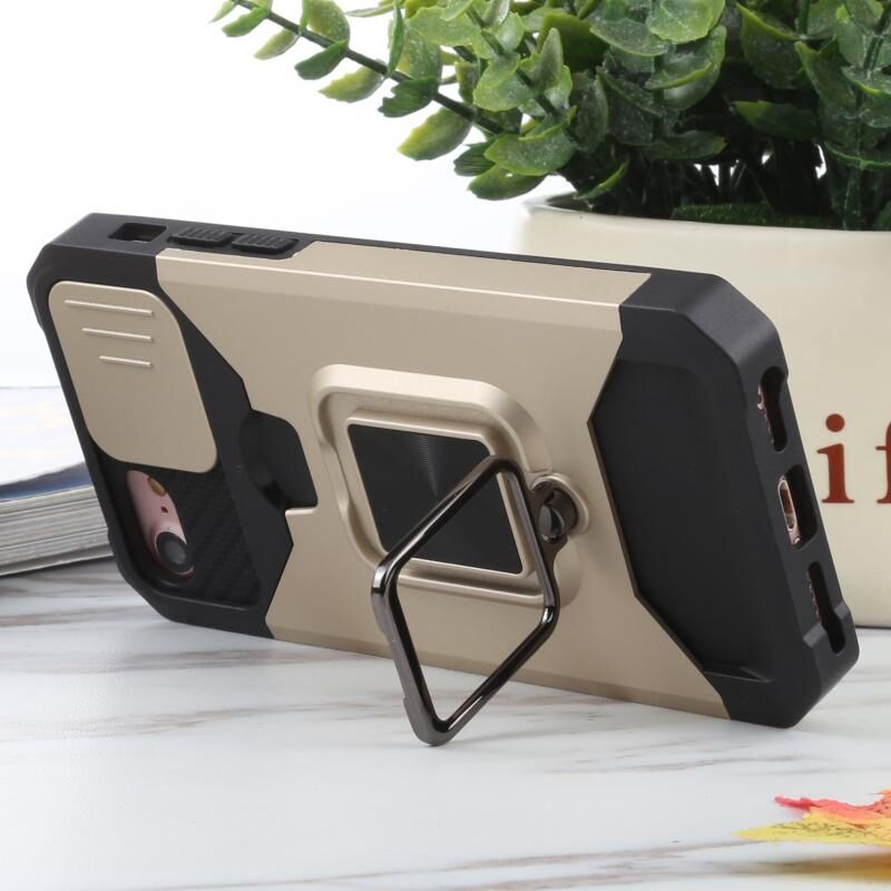 Θήκη για iPhone SE 2022 / SE 2020 / 8 / 7 / 6s / 6 με σχεδιασμό συρόμενου καλύμματος κάμερας, κατασκευασμένη από PC + TPU, ανθεκτική στις κρούσεις, με δακτύλιο στήριξης & θήκη για κάρτες (Μαύρο)