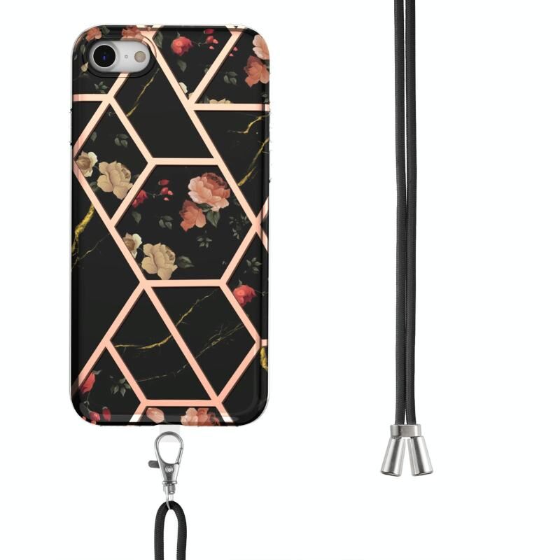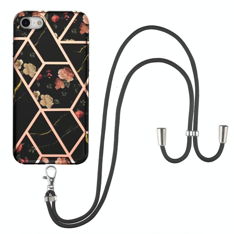 For iPhone SE 2022 / SE 2020 / 8 / 7 Electroplating Splicing Marble Flower Pattern TPU Shockproof Case with Lanyard(Black Flower)