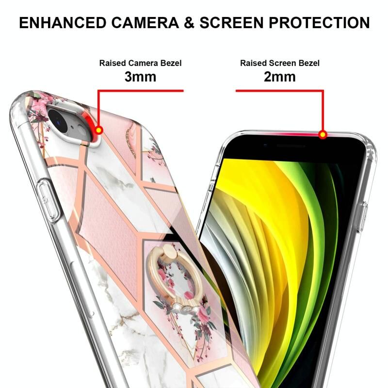 For iPhone SE 2022 / SE 2020 / 8 / 7 Electroplating Splicing Marble Flower Pattern TPU Shockproof Case with Rhinestone Ring Holder(Pink Flower)