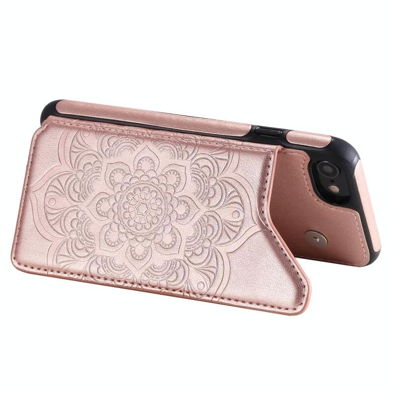 Θήκη προστασίας με σχέδιο λουλουδιών σε ανάγλυφο για iPhone SE 2022 / SE 2020 / 8 / 7, ανθεκτική σε κρούσεις, με βάση στήριξης, θήκες για κάρτες και κορνίζα φωτογραφιών (Ροζ χρυσός)