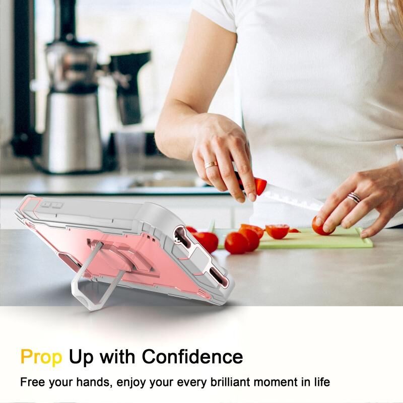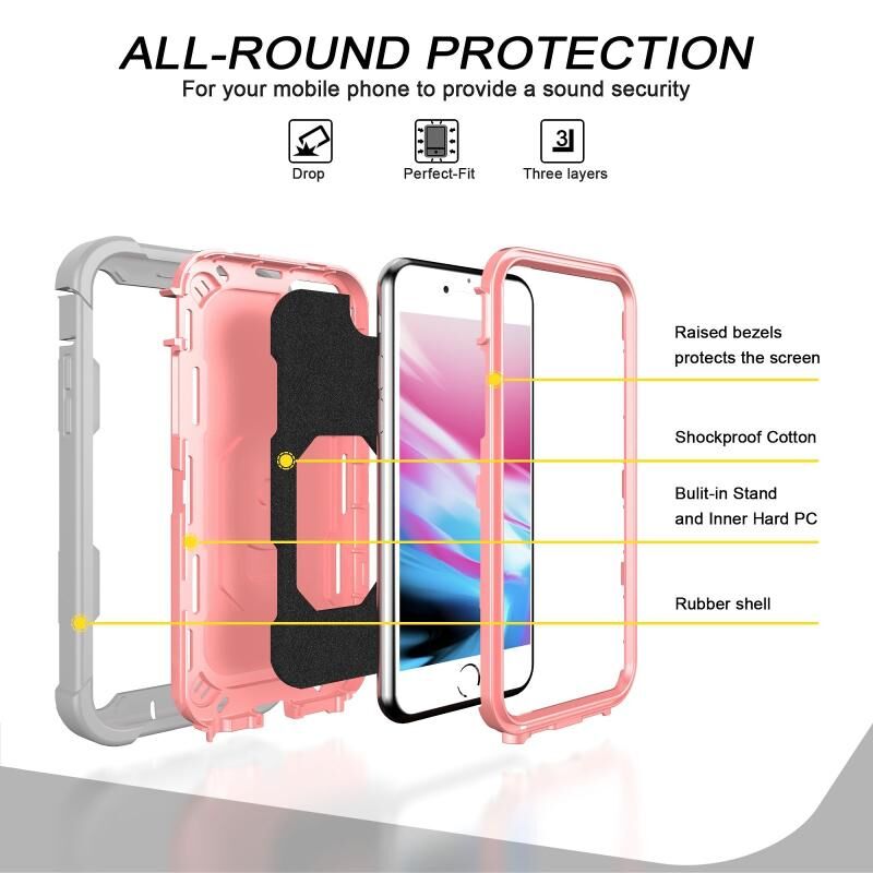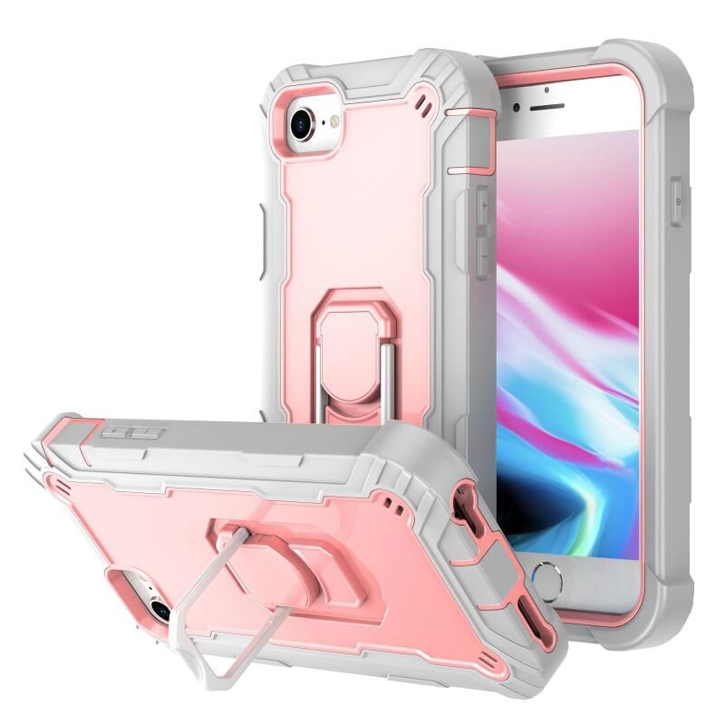 For iPhone SE 2022 / SE 2020 / 8 / 7 PC + Rubber 3-layers Shockproof Protective Case with Rotating Holder(Grey White + Rose Gold)