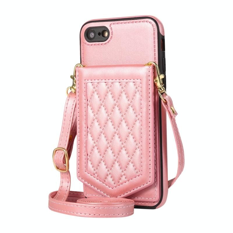 Θήκη κινητού τηλεφώνου με υφή ρόμβου και λουρί & καθρέφτη για iPhone SE 2022 / SE 2020 / 8 / 7 (Ροζ χρυσός)