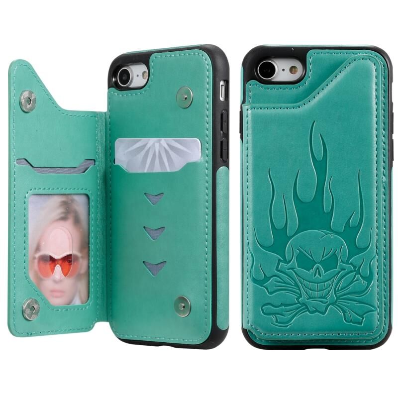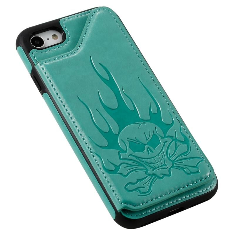 For iPhone SE 2022 / SE 2020 / 8 / 7 Skull Head Embossing Pattern Shockproof Protective Case with Holder & Card Slots & Wallet(Green)