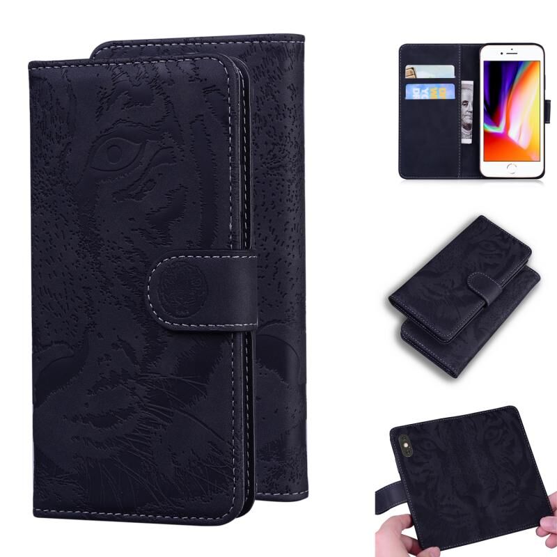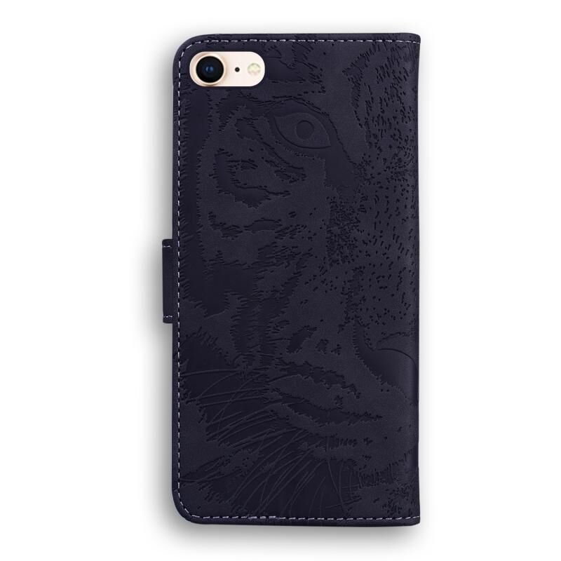 Θήκη δέρματος οριζόντιας αναδίπλωσης με ανάγλυφο μοτίβο τίγρης για iPhone SE 2022 / SE 2020 / 8 / 7 με βάση & υποδοχές καρτών & πορτοφόλι (Μαύρο)