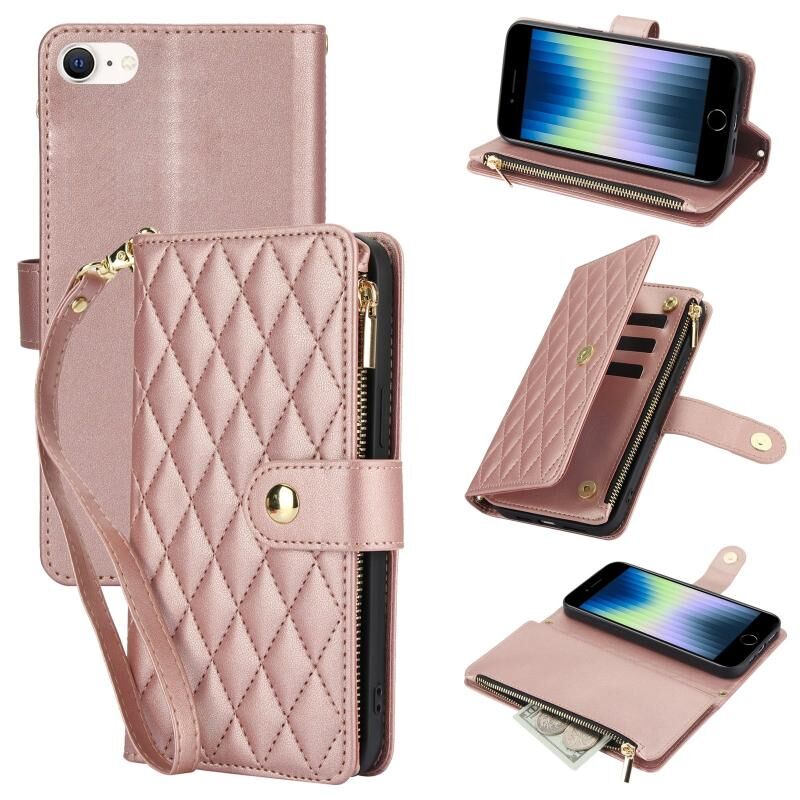 For iPhone SE 2022 / SE 2020 / 8 YM016 Rhombic Zipper Card Wallet Leather Phone Case with Lanyard(Rose Gold)