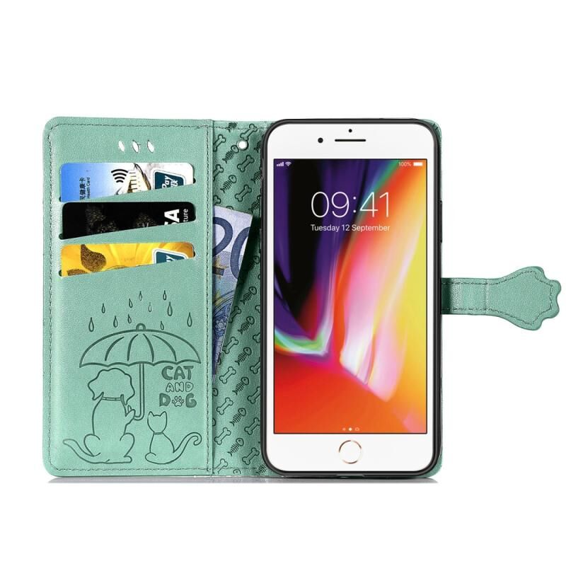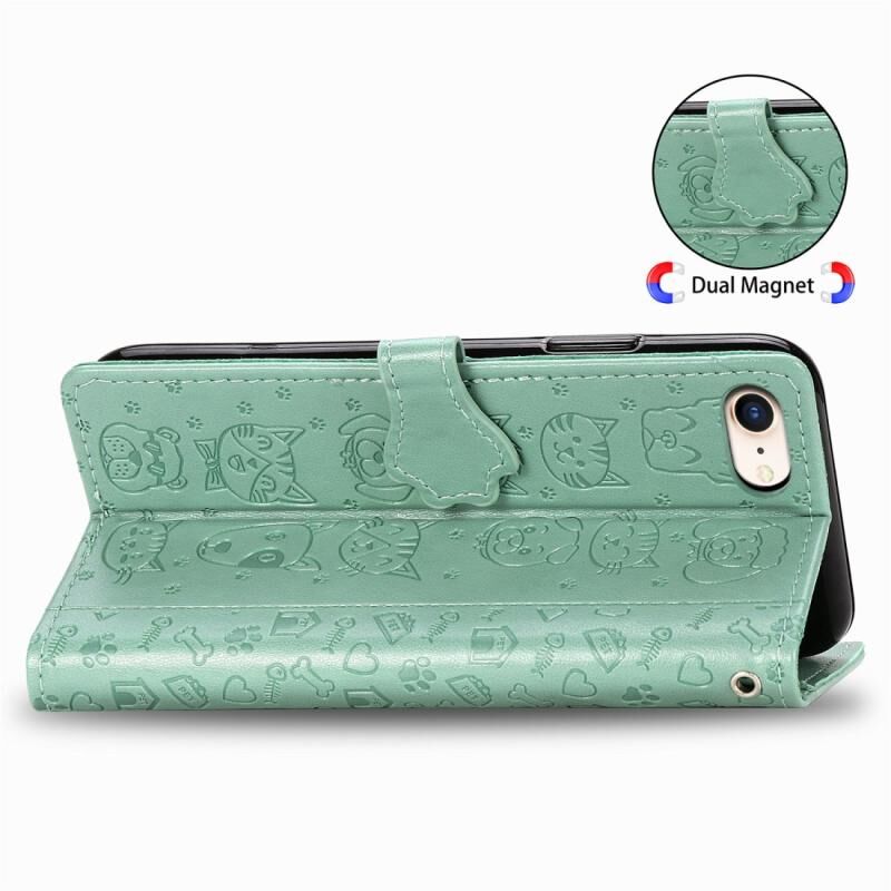 Θήκη δέρματος οριζόντιας αναδίπλωσης με ανάγλυφα σχέδια χαριτωμένων γάτας και σκύλου με βάση / υποδοχή κάρτας / πορτοφόλι / κορδόνι για iPhone SE 2022 / SE 2020 (Ροζ)