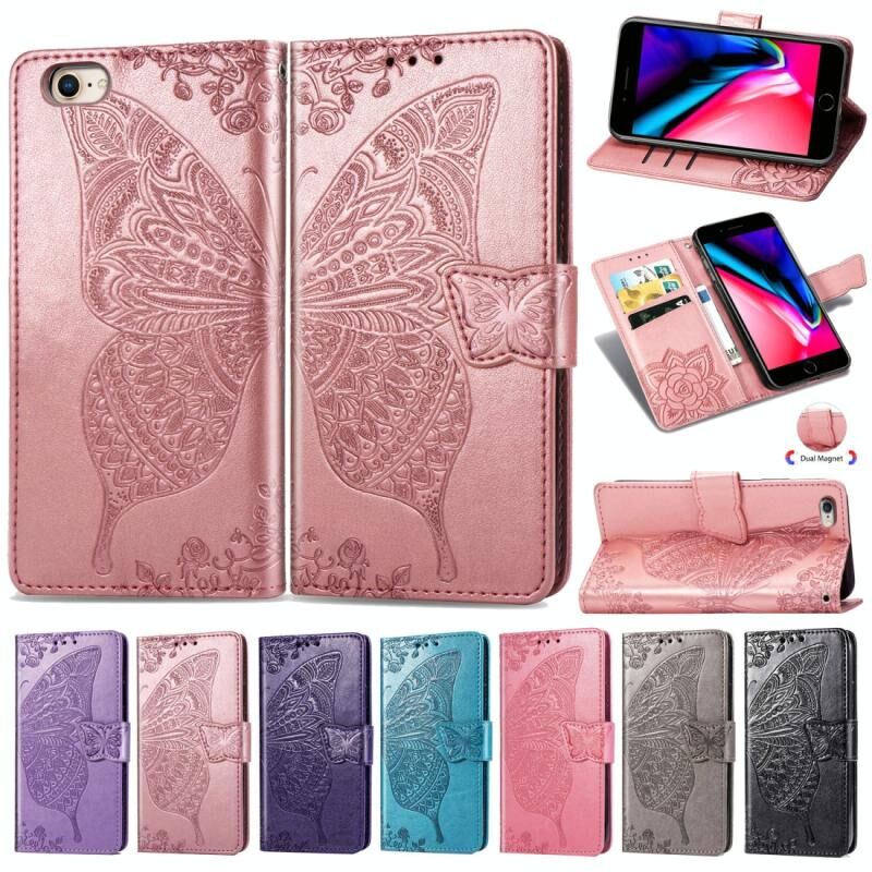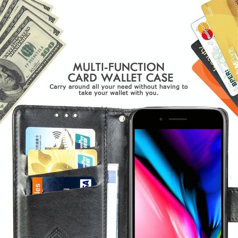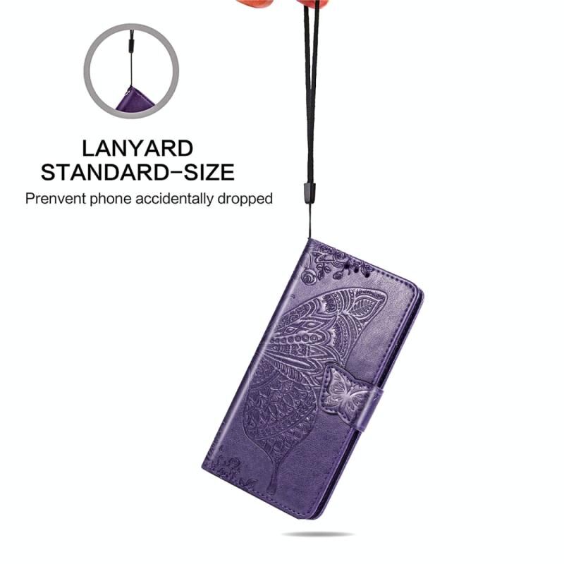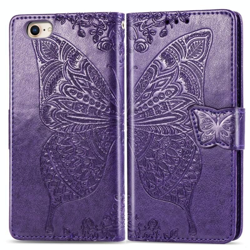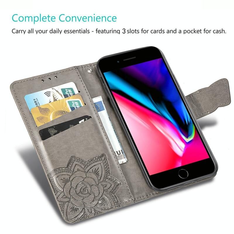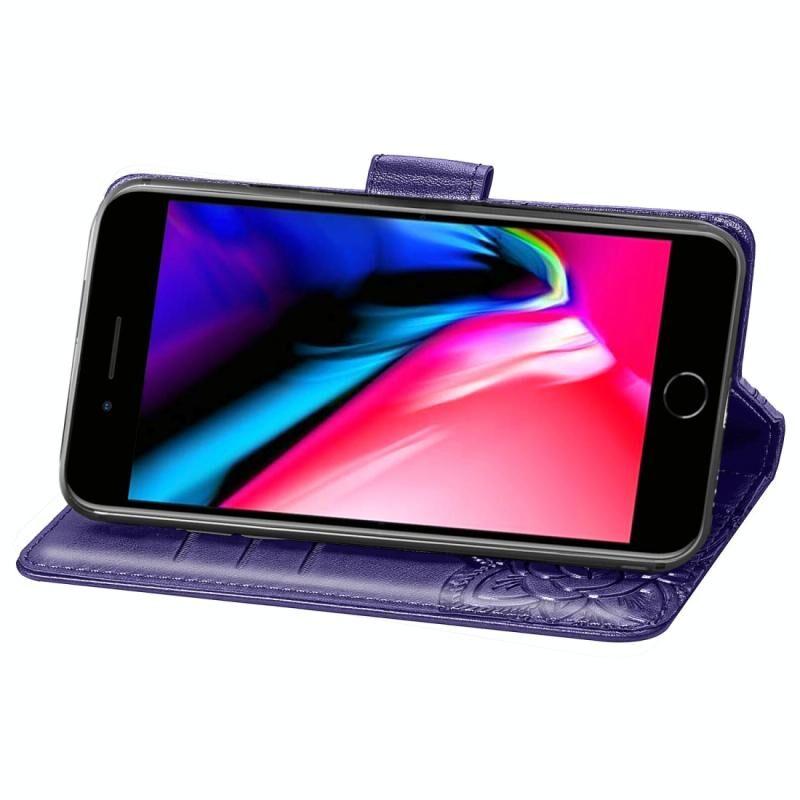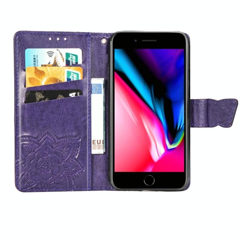 Για iPhone SE 2022 / SE 2020, Θήκη δέρματος οριζόντιας αναδίπλωσης με ανάγλυφο σχέδιο πεταλούδας και λουλουδιών, με βάση στήριξης / υποδοχή κάρτας / πορτοφόλι / κορδόνι (Σκούρο Μωβ)