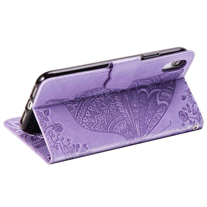Θήκη δέρματος οριζόντιας αναδίπλωσης για iPhone X με ανάγλυφο σχέδιο πεταλούδας, λουλουδιών, βάση στήριξης, θήκες καρτών, πορτοφόλι και λουρί (Σκούρο Μωβ)