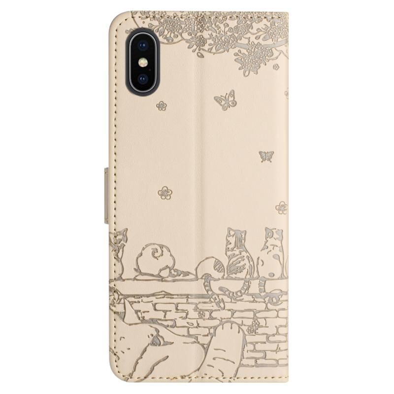 For iPhone X Cat Embossing Pattern Leather Phone Case with Lanyard(Beige)