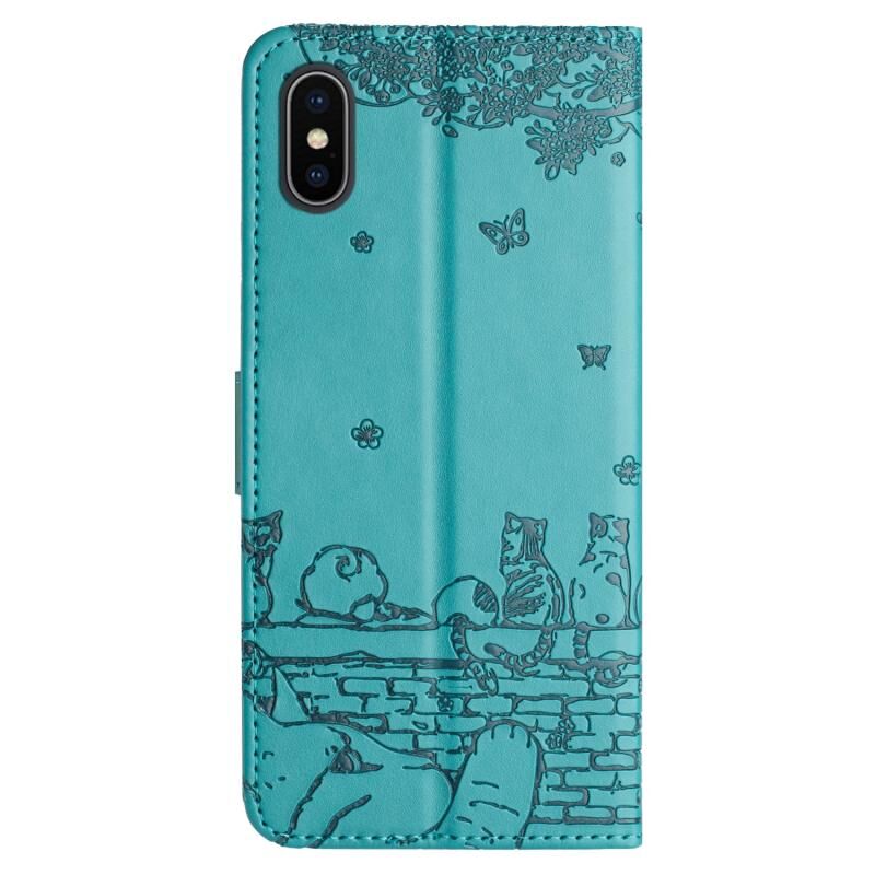 For iPhone X Cat Embossing Pattern Leather Phone Case with Lanyard(Blue)