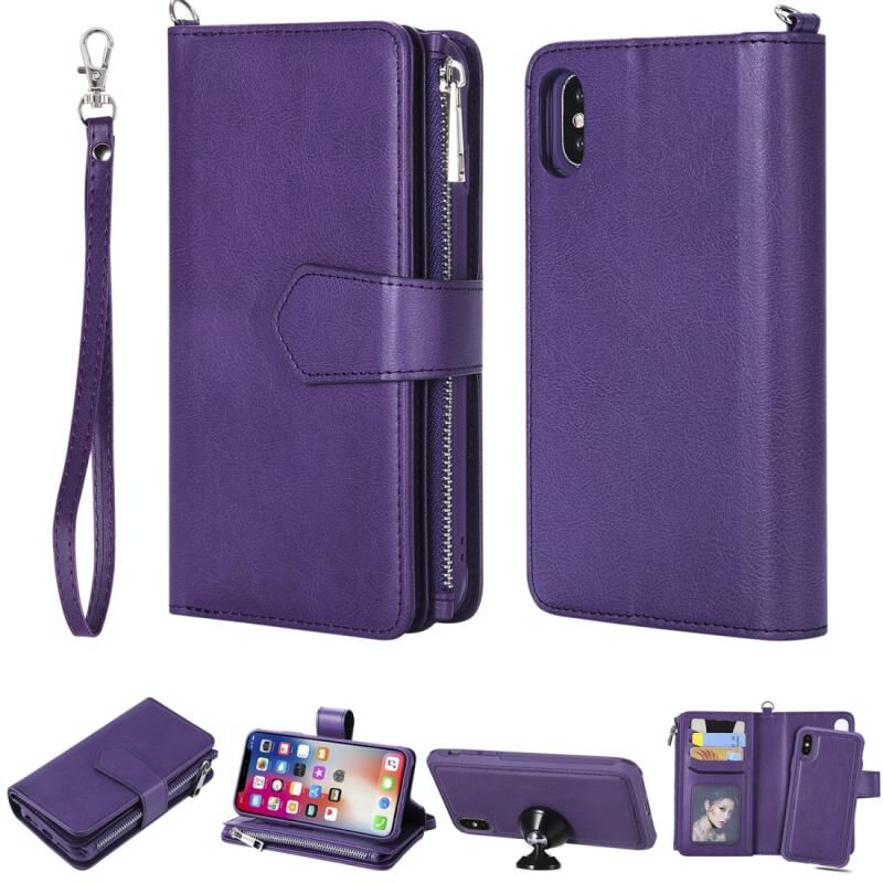 Θήκη 2 σε 1 για iPhone X / XS, μονόχρωμη, ανθεκτική σε κρούσεις με φερμουάρ, με θήκες για κάρτες, βάση στήριξης, θήκη φωτογραφιών & λειτουργία πορτοφολιού (Μωβ)