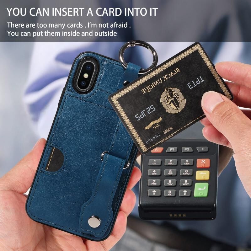Θήκη τηλεφώνου για iPhone X / XS με υφή μοσχαρίσιου δέρματος, κάρτα καρπού, δακτύλιος (Μπλε)