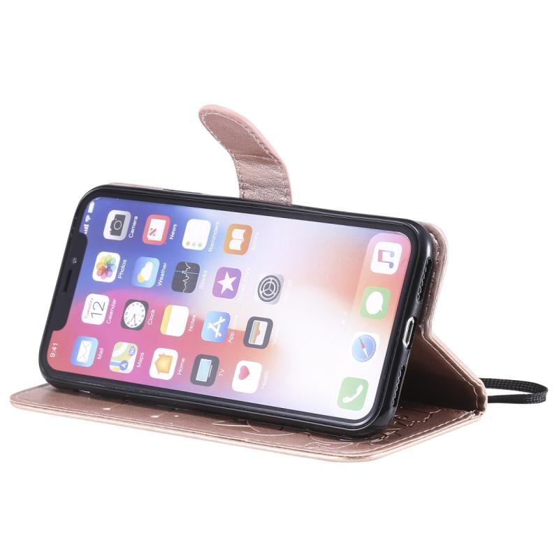 Θήκη δέρματος οριζόντιας αναδίπλωσης με σχέδιο ανάγλυφου γατιού και μέλισσας, ανθεκτική στις κρούσεις, για iPhone X / XS με βάση & υποδοχές καρτών & πορτοφόλι (Ροζ χρυσός)