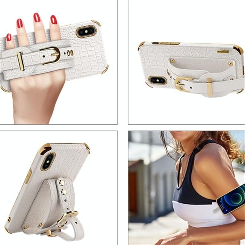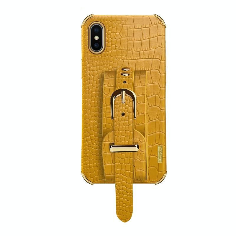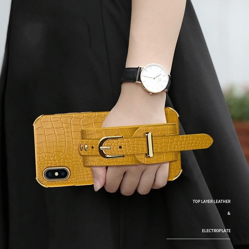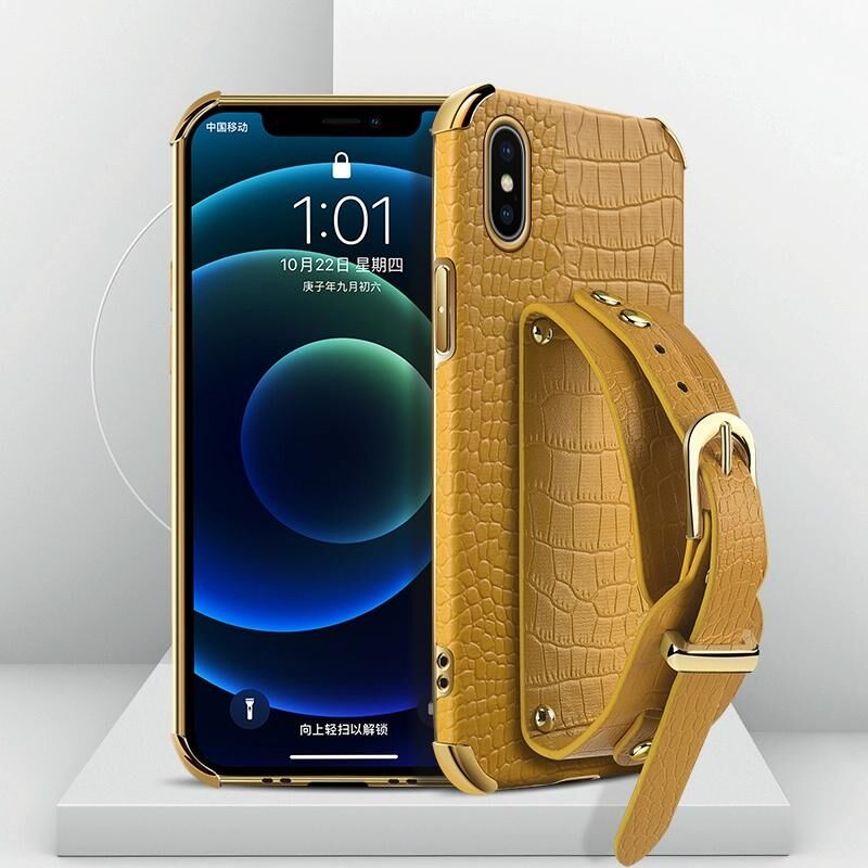 For iPhone X / XS Electroplated TPU Crocodile Pattern Leather Case with Wrist Strap(Yellow)