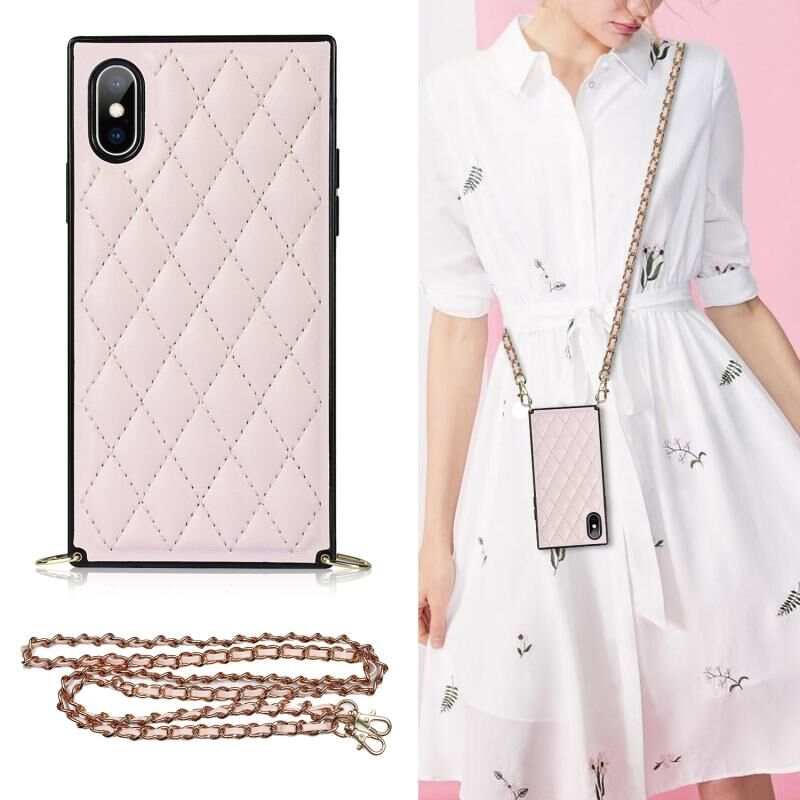 Για iPhone X / XS Κομψή Θήκη από Δέρμα Μικροϊνών με Ρομβικό Σχέδιο + TPU Ανθεκτική στις Κραδασμούς με Αλυσίδα Λουριού Χιαστί (Λευκό)