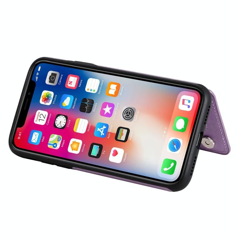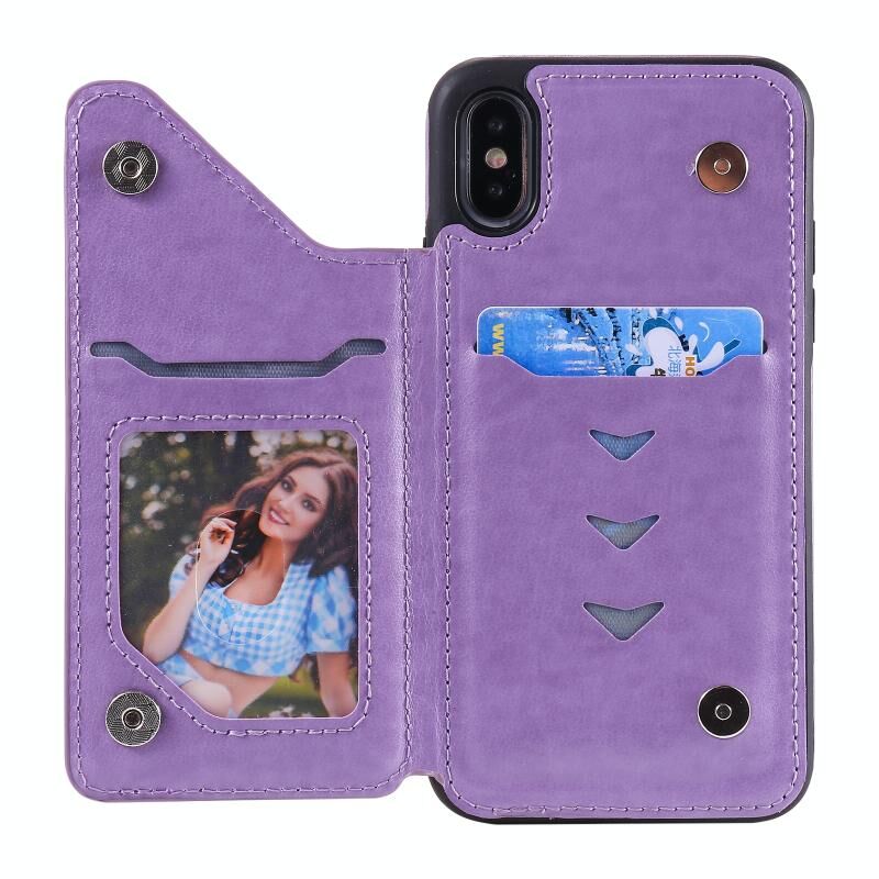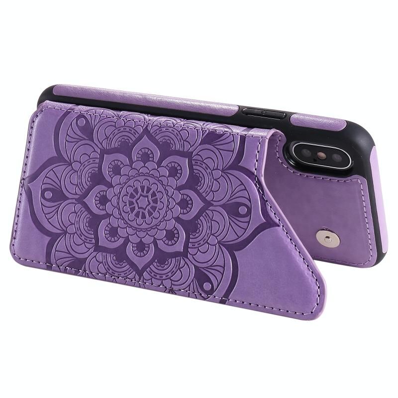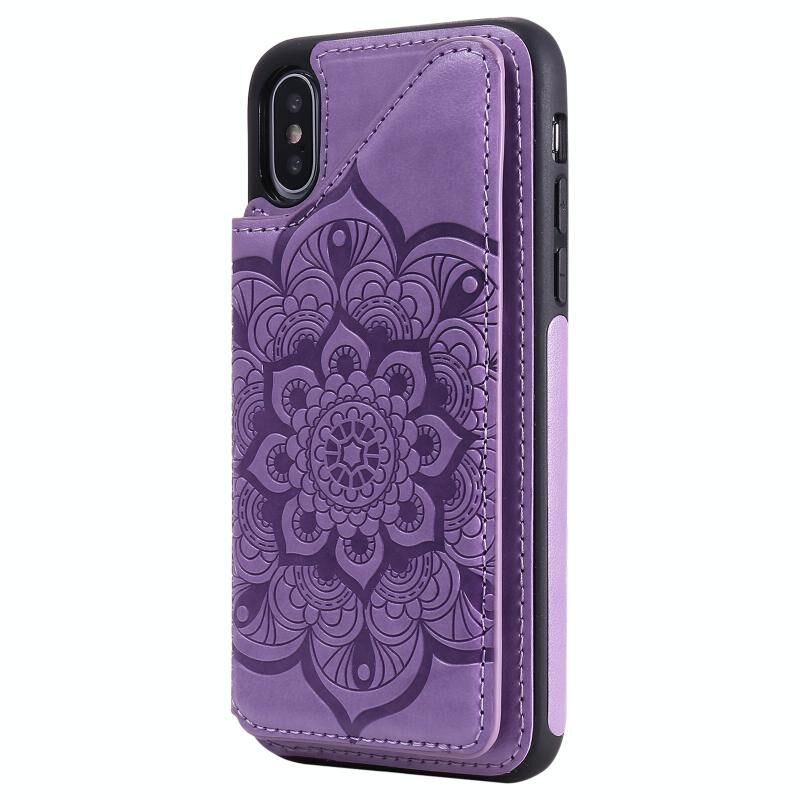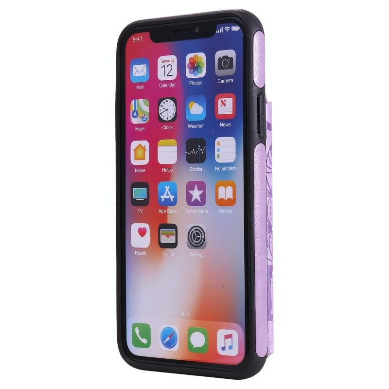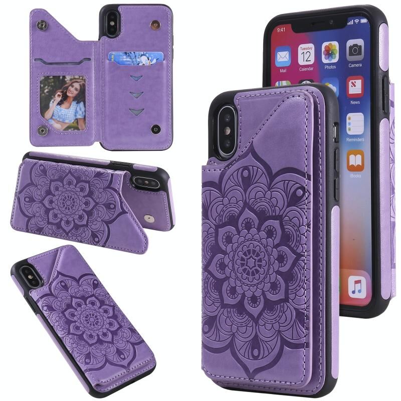 Θήκη προστασίας για iPhone X / XS με ανάγλυφο σχέδιο λουλουδιών, αντικραδασμική, με βάση στήριξης & θήκες για κάρτες & κορνίζα φωτογραφιών (Μωβ)