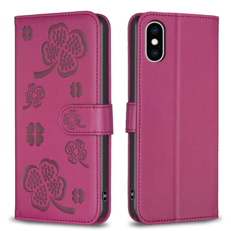 Θήκη τηλεφώνου από δέρμα με ανάγλυφο τετράφυλλο για iPhone X / XS (Κόκκινο Ρόδο)