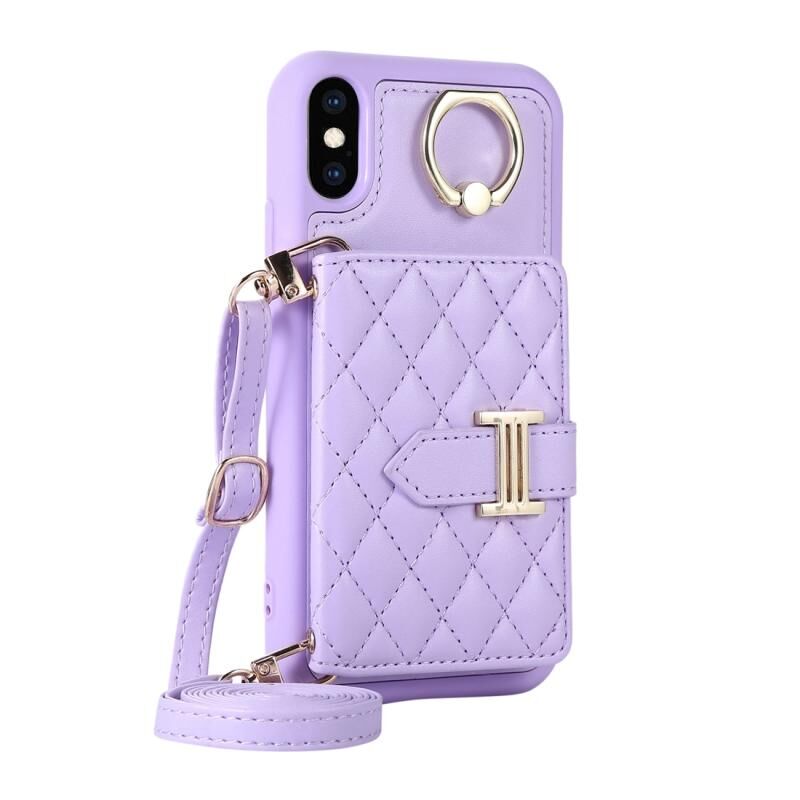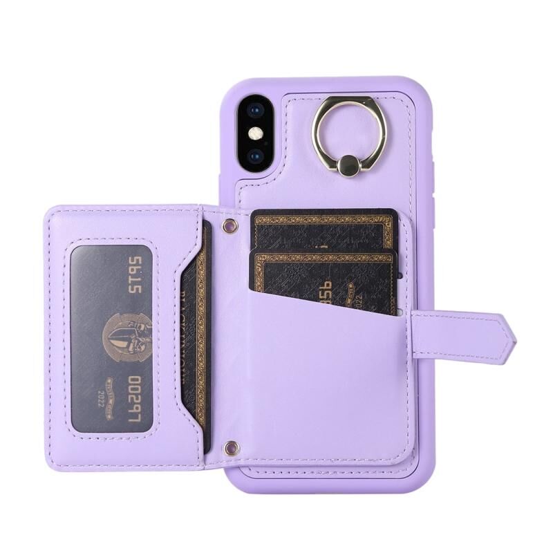 For iPhone X / XS Horizontal Card Bag Ring Holder Phone Case with Dual Lanyard(Dark Purple)