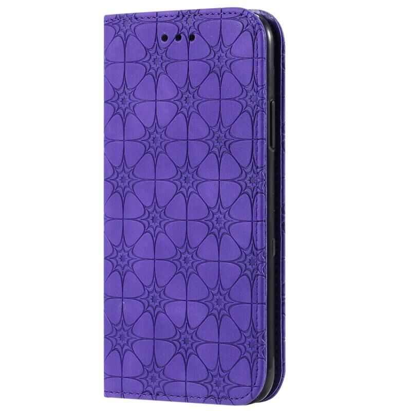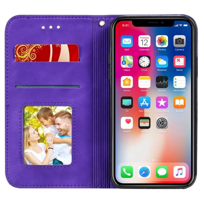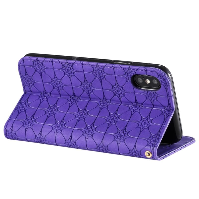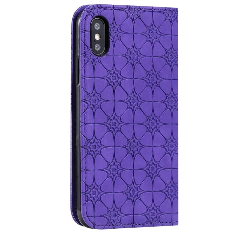 Θήκη δέρματος με μαγνητικό κλείσιμο, οριζόντια, με ανάγλυφο σχέδιο τυχερών λουλουδιών και θήκη/υποδοχές για κάρτες για iPhone X / XS (Μωβ)