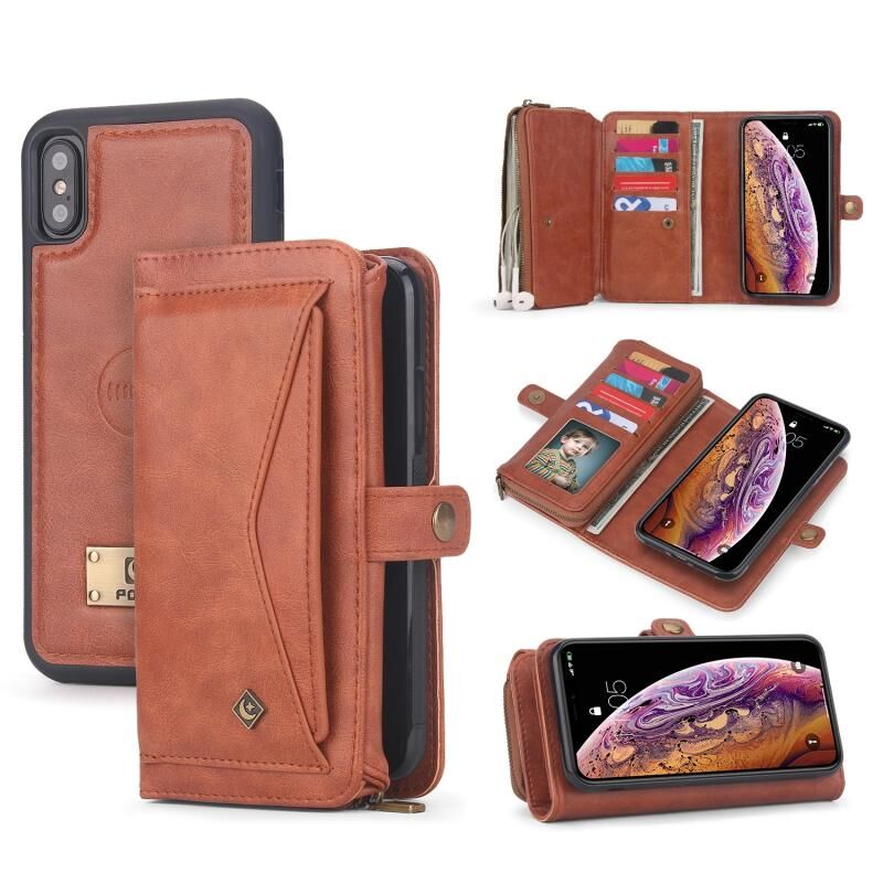 Θήκη τηλεφώνου από δέρμα με φερμουάρ, πολυλειτουργική για iPhone X / XS (Καφέ)