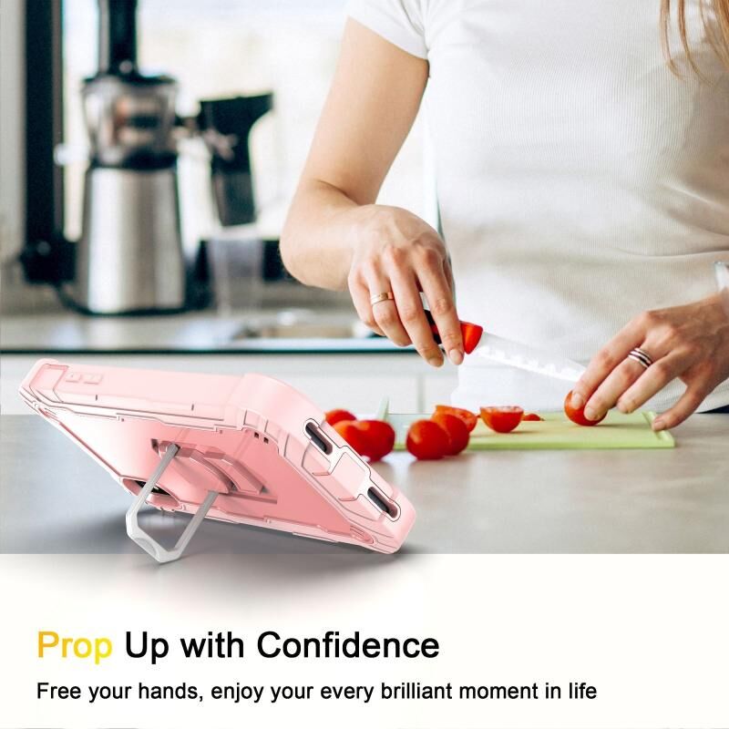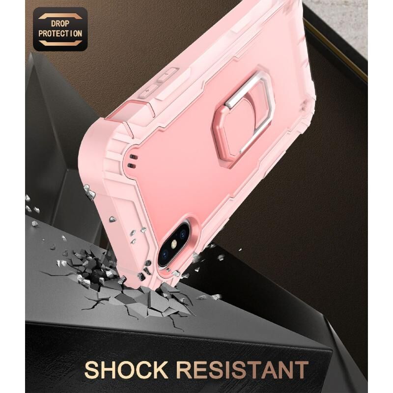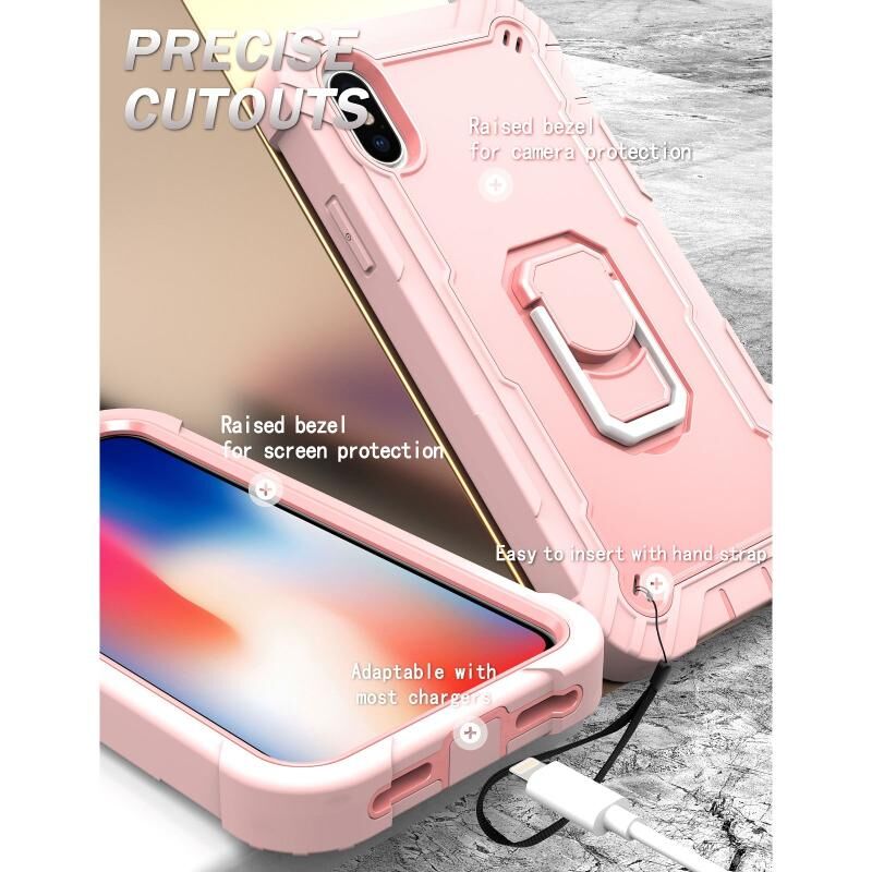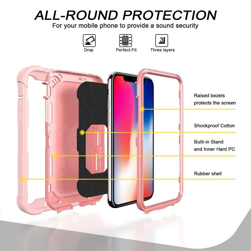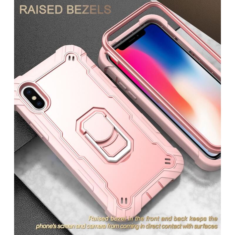 For iPhone X / XS PC + Rubber 3-layers Shockproof Protective Case with Rotating Holder(Rose Gold)