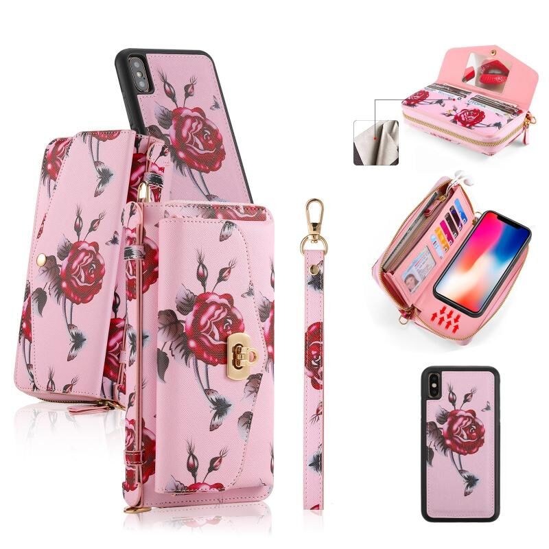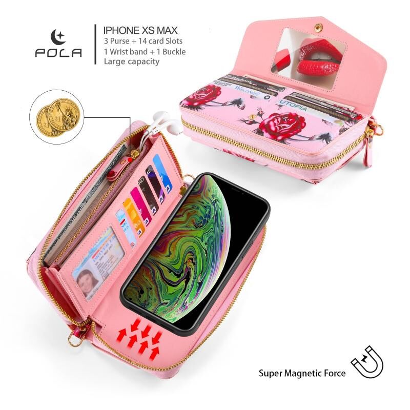 Θήκη τηλεφώνου από δέρμα, πολυλειτουργική, με φερμουάρ και λουρί για iPhone X / XS POLA (Μαύρο)