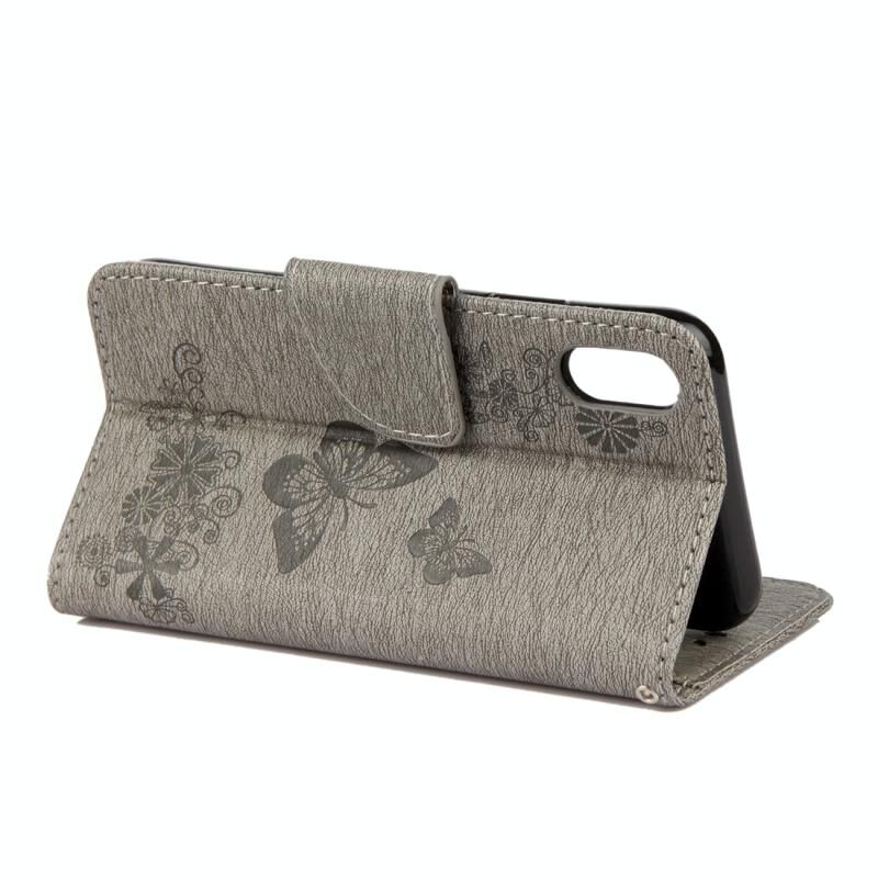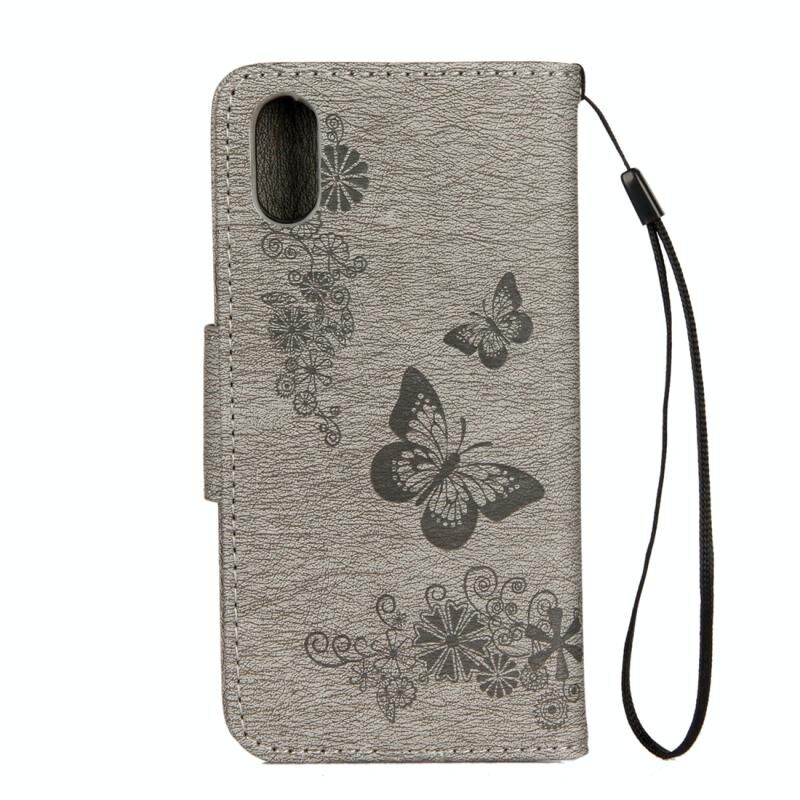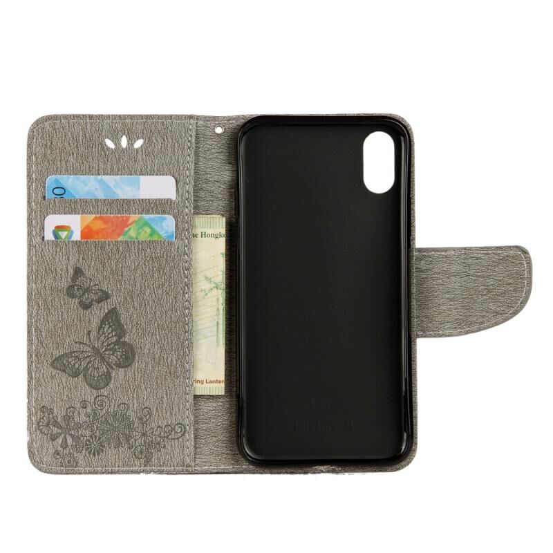 Θήκη δέρματος οριζόντιας αναδίπλωσης για iPhone X / XS με σχέδιο πεταλούδας και πιεσμένα λουλούδια, με βάση, θήκες καρτών, πορτοφόλι και κορδόνι (Μαύρο)