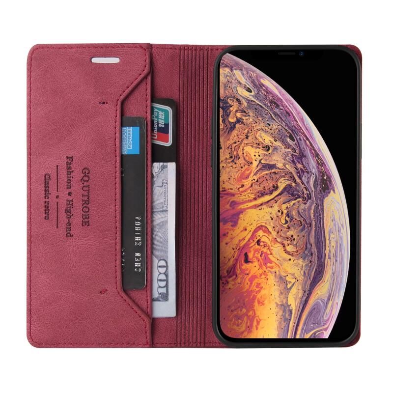Θήκη δέρματος οριζόντιας αναδίπλωσης με αίσθηση δέρματος για iPhone X / XS, αντι-κλοπής, με βάση & υποδοχές καρτών & πορτοφόλι (Κρασοκόκκινο)
