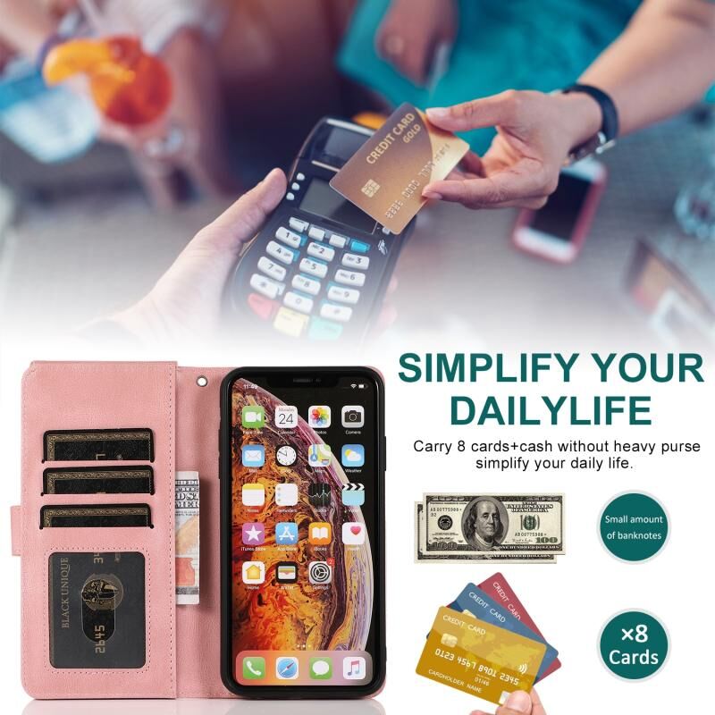 Θήκη για iPhone X / XS με υφή Crazy Horse, αίσθηση δέρματος, οριζόντια θήκη flip με φερμουάρ, με βάση & υποδοχές καρτών & πορτοφόλι & κορδόνι (Ροζ χρυσός)