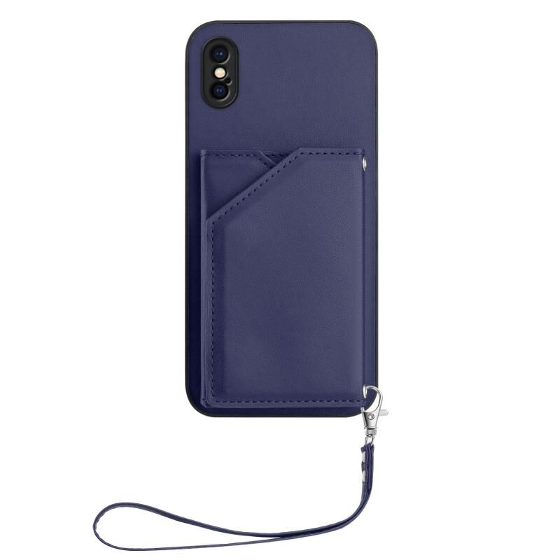 For iPhone X / XS Skin Feel Four Card Slots Phone Case with Wrist Strap(Blue)