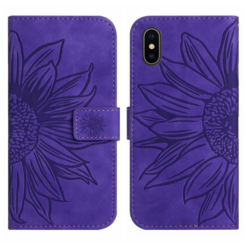 Θήκη τηλεφώνου από δέρμα με σχέδιο ηλίανθου και αίσθηση δέρματος για iPhone X / XS, με κορδόνι (Σκούρο Μωβ)