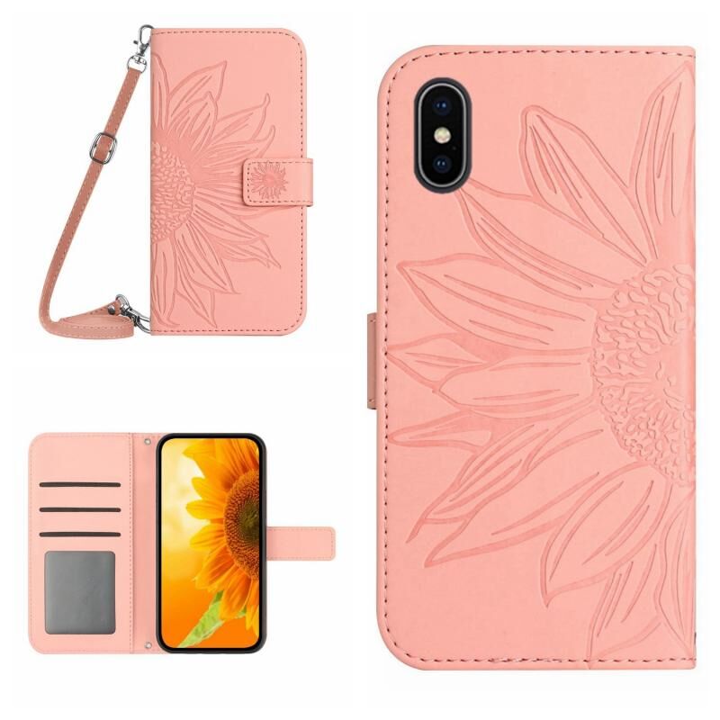 Θήκη τηλεφώνου από δέρμα με σχέδιο ηλίανθου και αίσθηση δέρματος για iPhone X / XS, με λουρί (Κόκκινο)