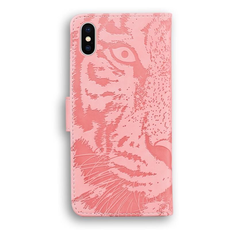 Θήκη δέρματος οριζόντιας αναδίπλωσης με ανάγλυφο μοτίβο τίγρης για iPhone X / XS με βάση & υποδοχές καρτών & πορτοφόλι (Καφέ)