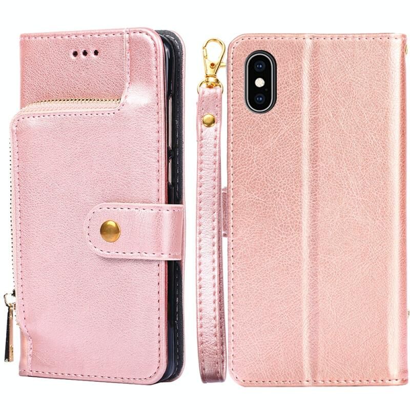 Θήκη δέρματος οριζόντιας αναδίπλωσης με φερμουάρ για iPhone X / XS, από PU + TPU, με θήκη, υποδοχή κάρτας, πορτοφόλι & λουρί (Χρυσός)