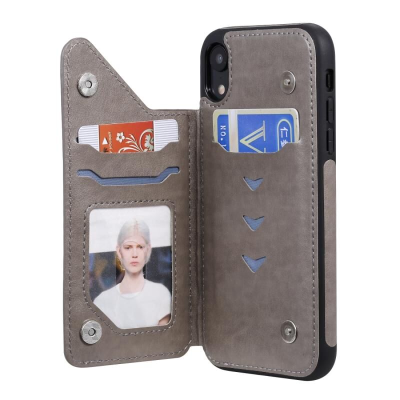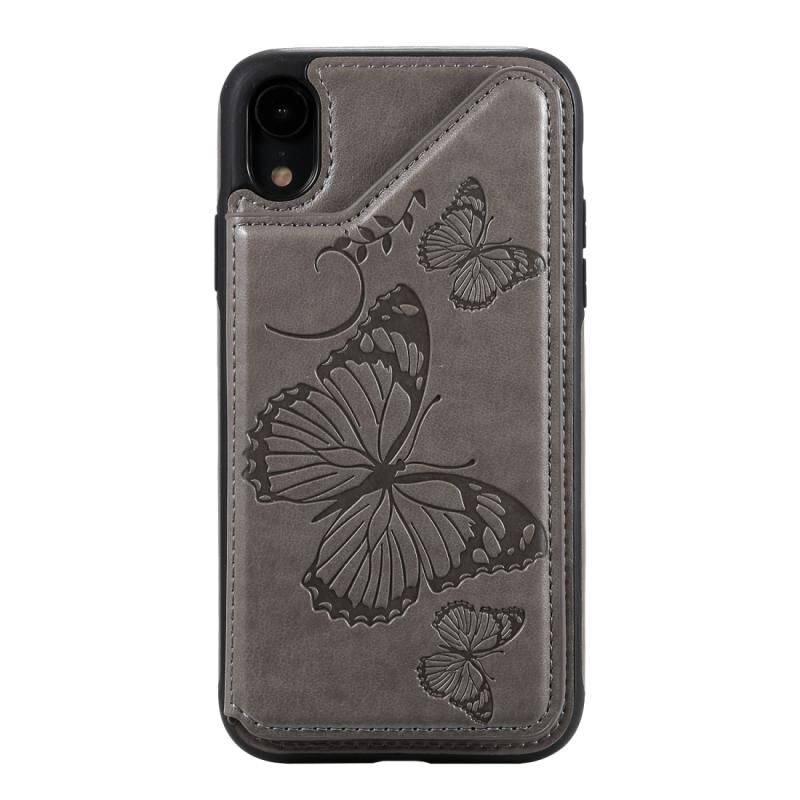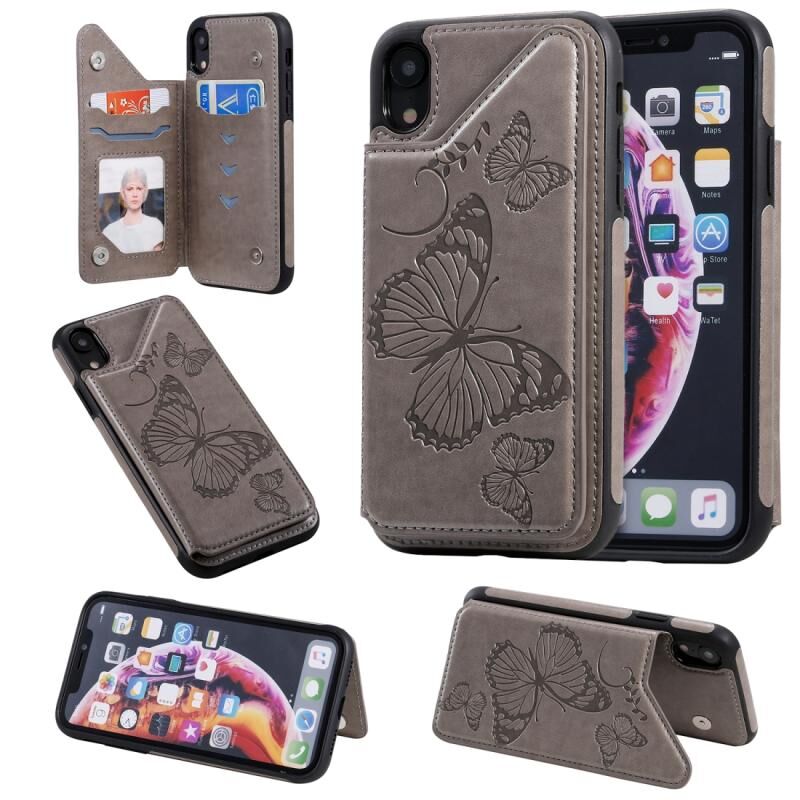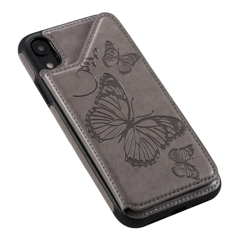 For iPhone XR Butterfly Embossing Pattern Shockproof Protective Case with Holder & Card Slots & Photo Frame(Gray)