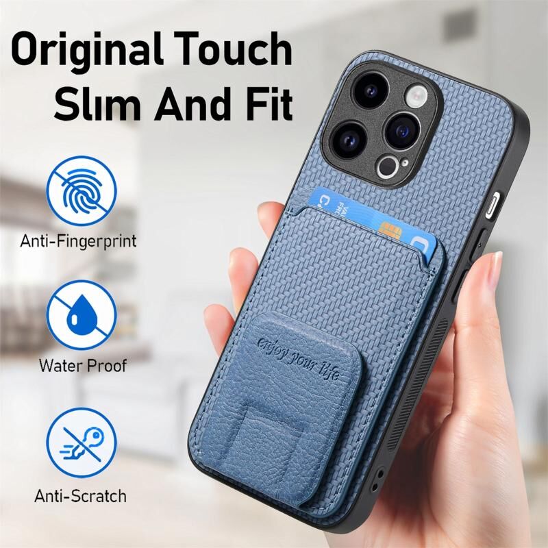 Θήκη τηλεφώνου για iPhone XR από ανθρακονήματα με θήκη κάρτας και βάση στήριξης (Μπλε)