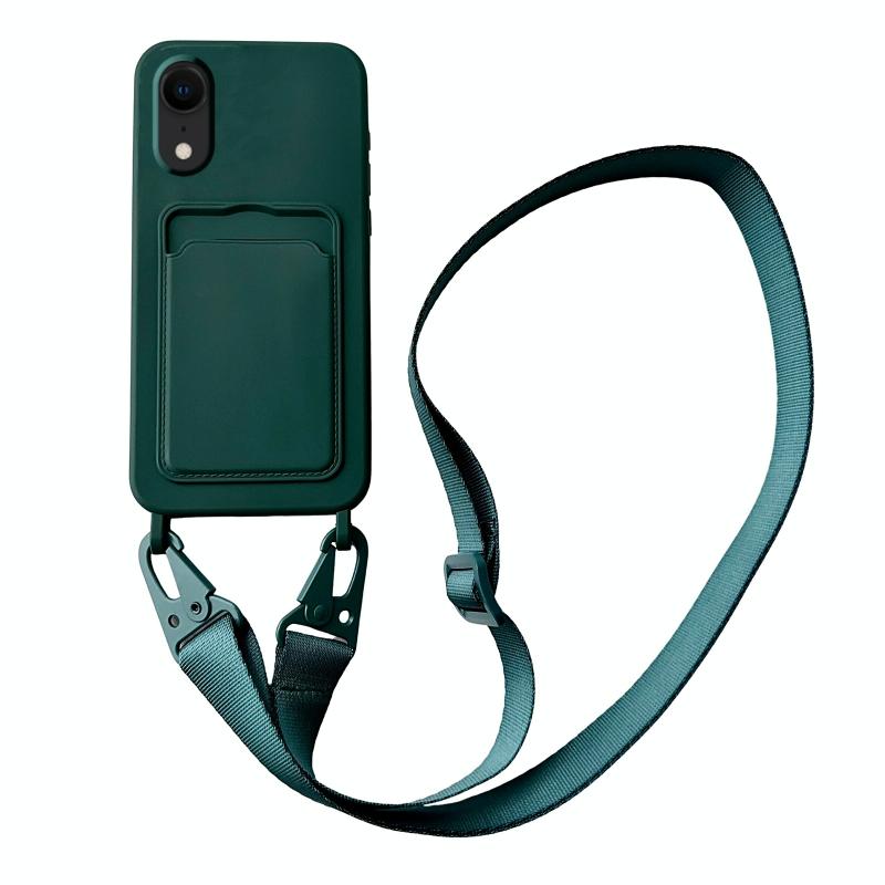 For iPhone XR Card Slot Liquid Silicone Phone Case with Lanyard(Dark Green)