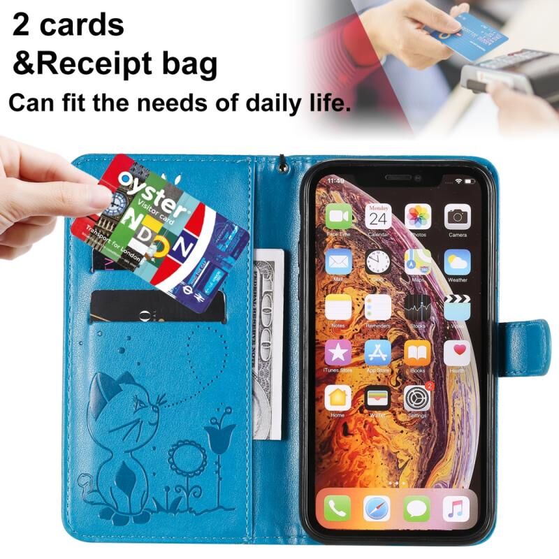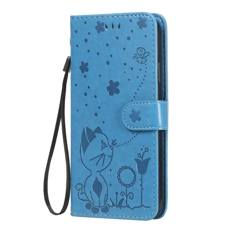 Θήκη δέρματος οριζόντιας αναδίπλωσης για iPhone XR με ανάγλυφο σχέδιο Γάτας και Μέλισσας, ανθεκτική στις κρούσεις, με βάση στήριξης & υποδοχές καρτών & πορτοφόλι (Μπλε)