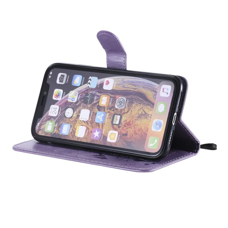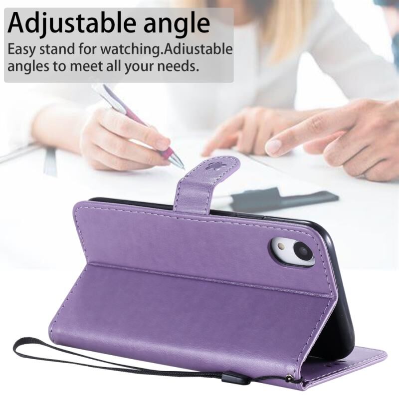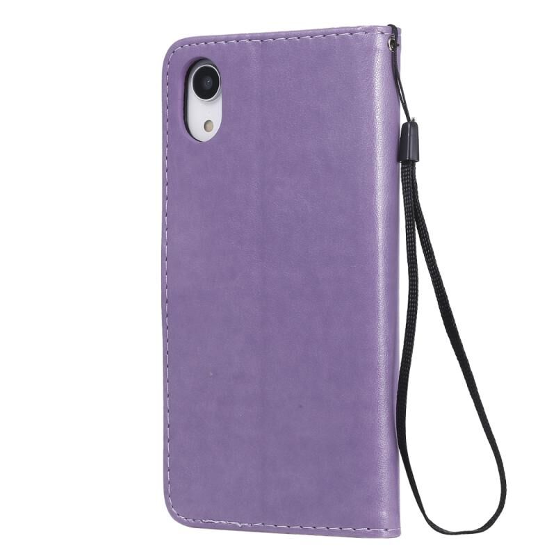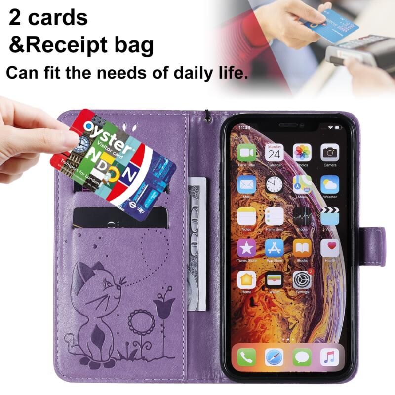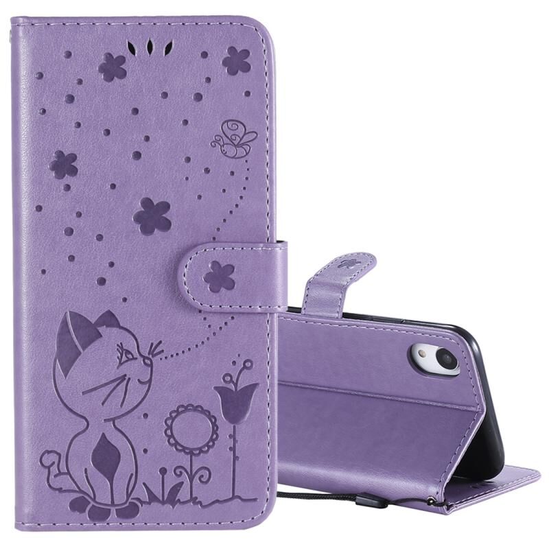 Θήκη δέρματος οριζόντιας αναδίπλωσης για iPhone XR με ανάγλυφο σχέδιο Γάτας και Μέλισσας, ανθεκτική στις κρούσεις, με βάση στήριξης & υποδοχές καρτών & πορτοφόλι (Μωβ)