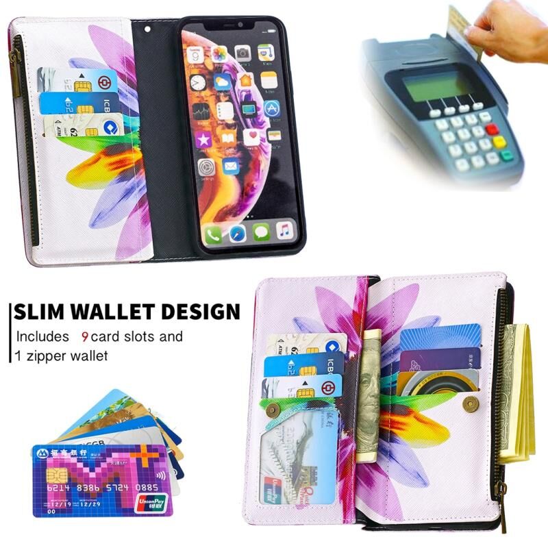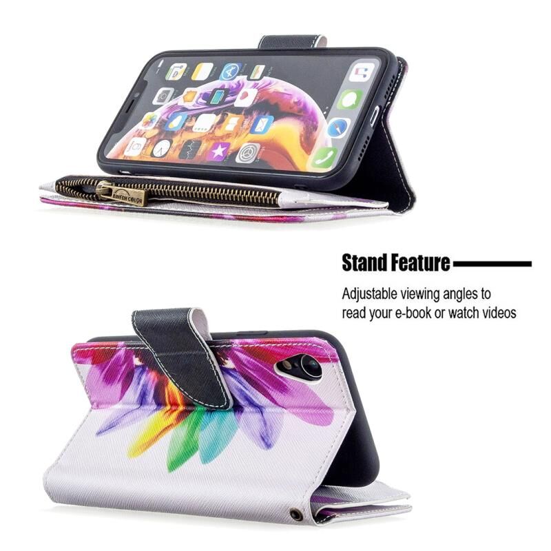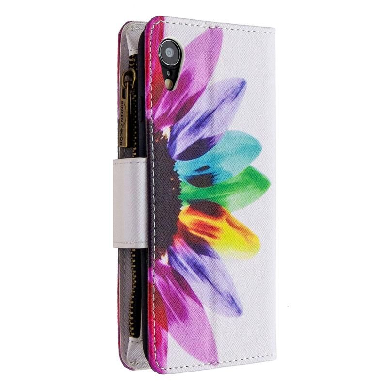 Θήκη δέρματος οριζόντιας αναδίπλωσης με φερμουάρ για iPhone XR με σχέδιο πολύχρωμης ζωγραφικής, με βάση & υποδοχές καρτών & πορτοφόλι (Ηλίανθος)