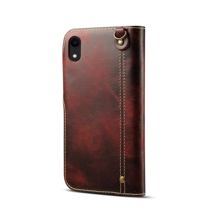 For iPhone XR Denior Oil Wax Cowhide Magnetic Button Horizontal Flip Leather Case with Card Slots & Wallet(Dark Red) (Denior)