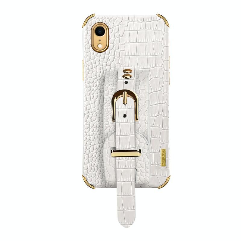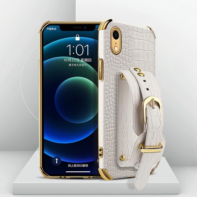 For iPhone XR Electroplated TPU Crocodile Pattern Leather Case with Wrist Strap(White)