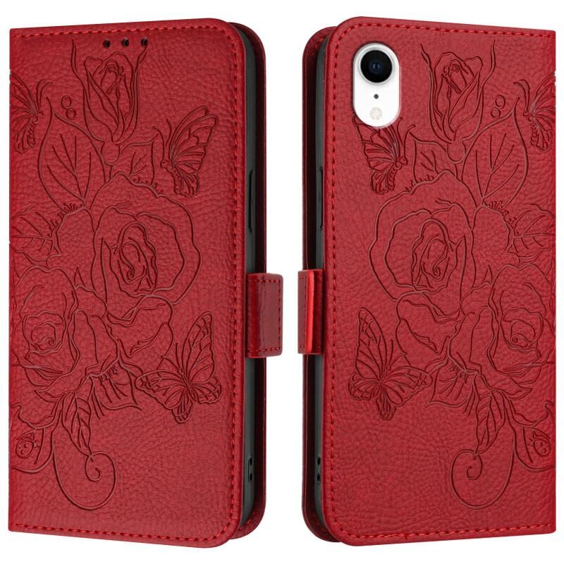 Θήκη τηλεφώνου δερμάτινη με ανάγλυφο σχέδιο τριαντάφυλλου και προστασία RFID κατά της κλοπής για iPhone XR (Κόκκινη)