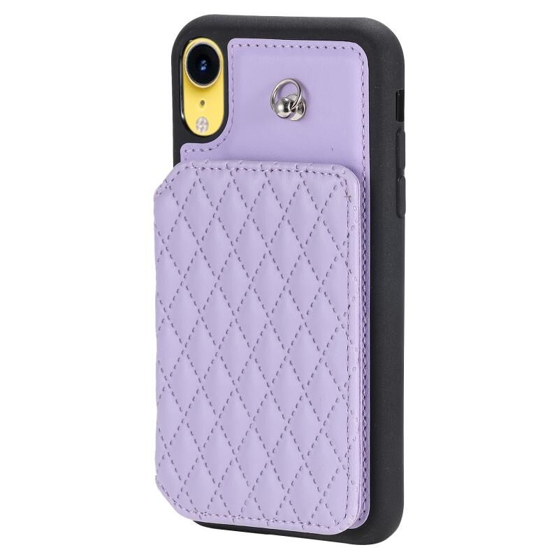 For iPhone XR Grid Texture Card Bag Phone Case with Lanyard(Purple)