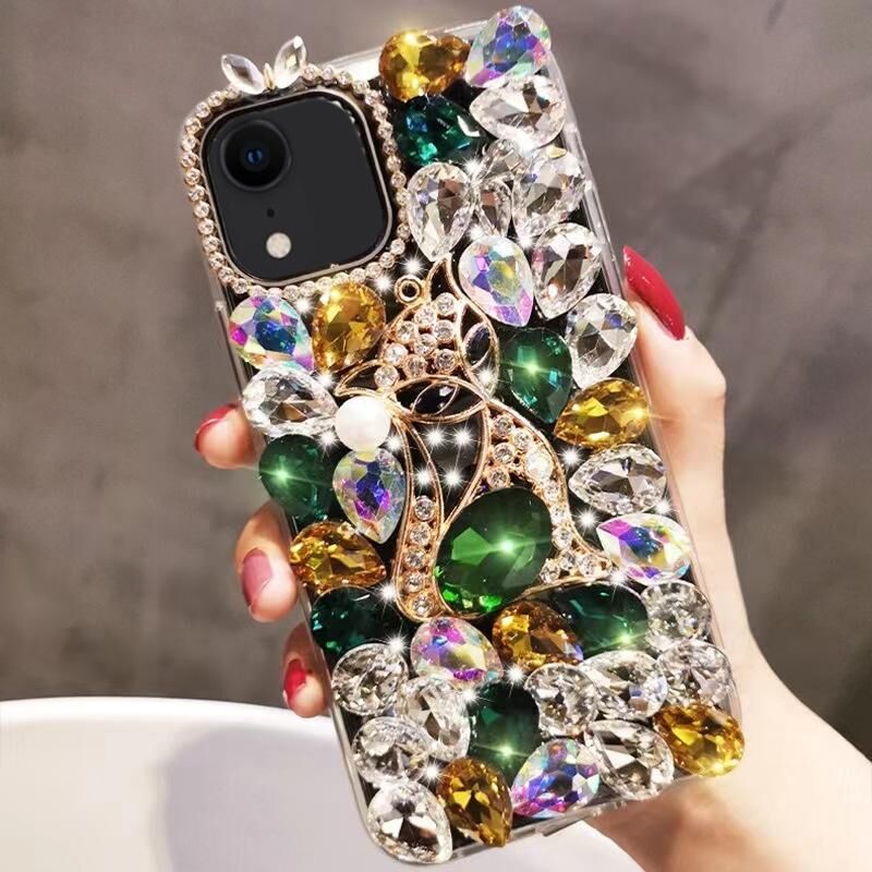 For iPhone XR Handmade Bling Rhinestone Gemstone Fox PC Phone Case(Green)