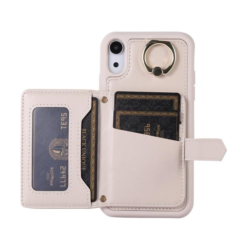 For iPhone XR Horizontal Card Bag Ring Holder Phone Case with Dual Lanyard(Beige)