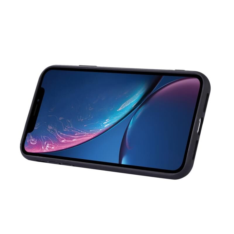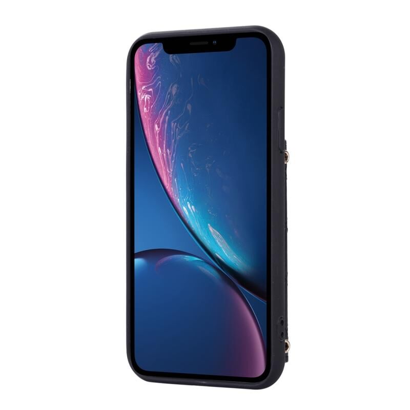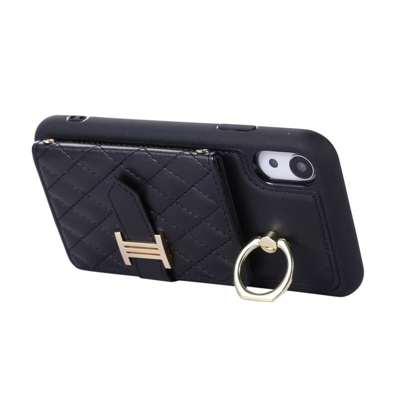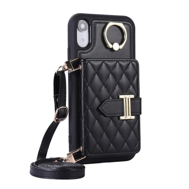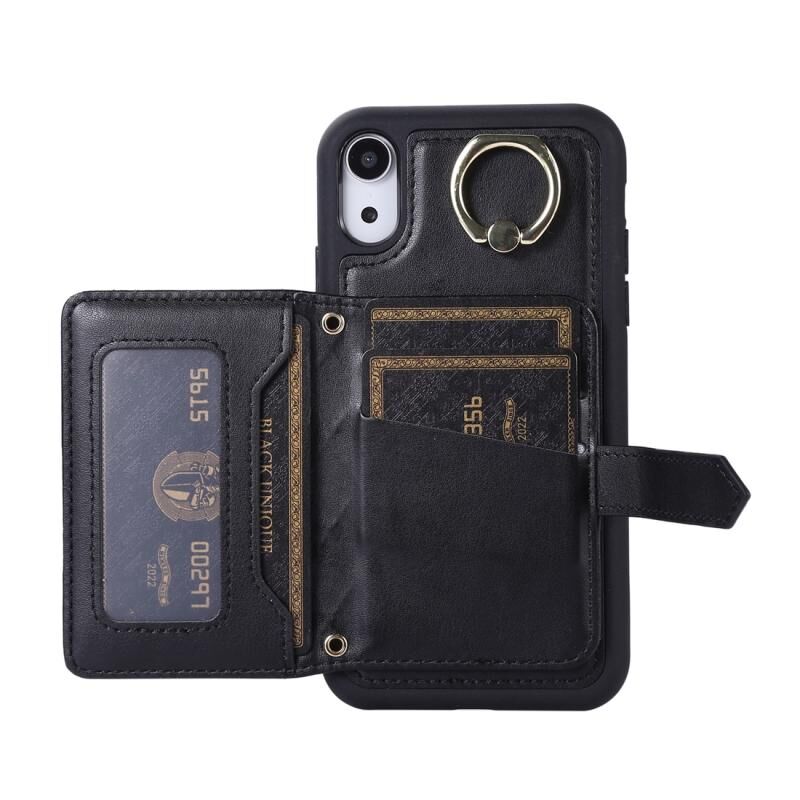 For iPhone XR Horizontal Card Bag Ring Holder Phone Case with Dual Lanyard(Black)
