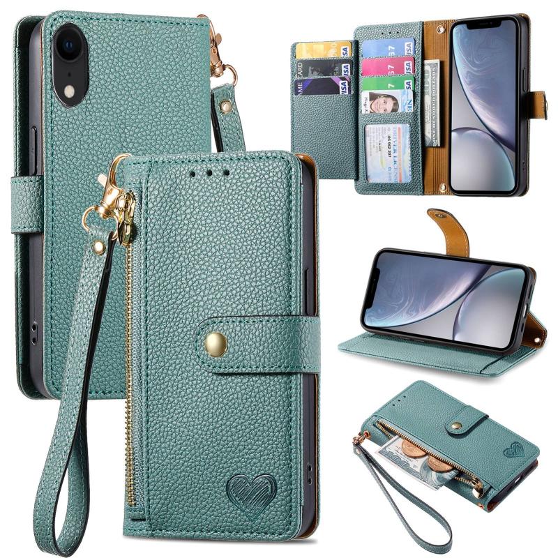 For iPhone XR Love Zipper Lanyard Leather Phone Case(Green)