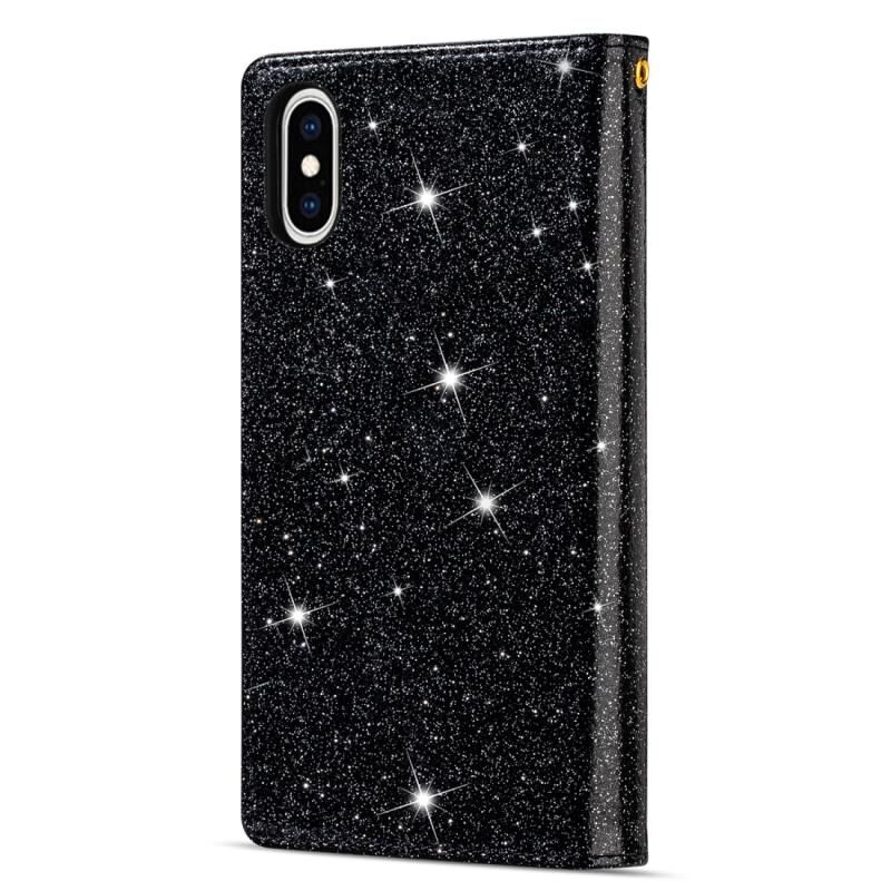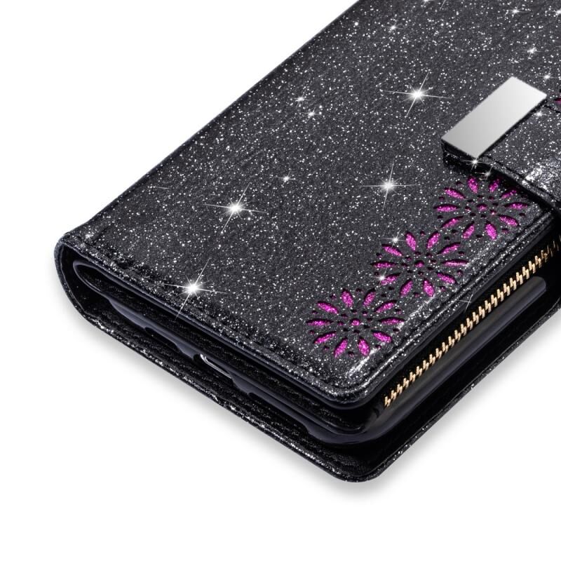 For iPhone XR Multi-card Slots Starry Sky Laser Carving Glitter Zipper Horizontal Flip Leather Case with Holder & Wallet & Lanyard(Black)